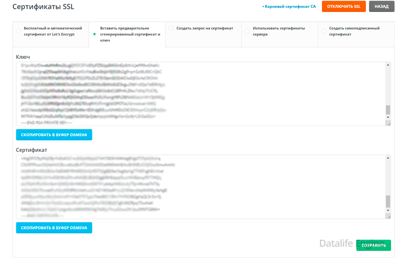 -----END CERTIFICATE----- Во второе - ключ сертификата:-----BEGIN RSA PRIVATE KEY-----