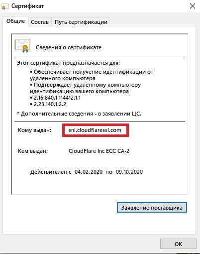 На бесплатном тарифе сервиса предоставляется услуга по выпуску сертификата SSL, однако, как говорят, есть нюансы. Сертификат на бесплатном тарифе Cloudflare подключается не для вашего домена, а выпущен для домена, который обеспечивает DNS хостинг ресурса. Проще говоря, в сведениях о сертификате указан не ваш ресурс, а sni.cloudflaressl.com, что в некоторых случаях может вызвать конфликты скриптов, сервисов и пр.